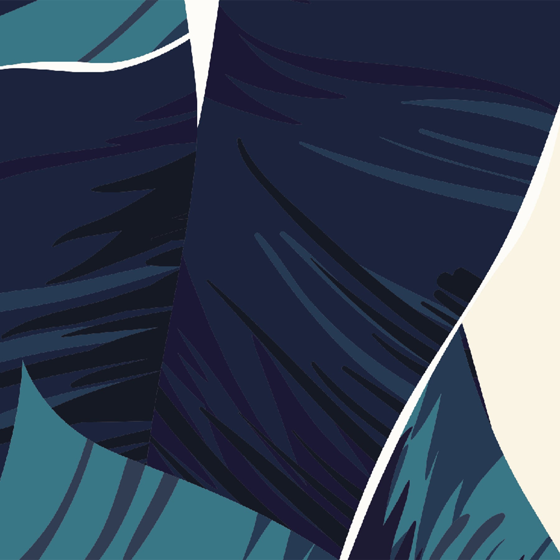 A tropical print of blue banana leaves on an off white background. Lovely and lush, this leafy retro print works perfectly in kitchens, bathrooms and fabulous hallways.